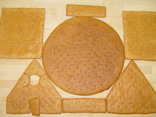 Die folgende Bauanleitung ist nur ein Beispiel, das beliebig variiert und den eigenen Vorstellungen angepasst werden kann. Entsprechende Schablonen für die Hausteile sind schnell aus Karton ausgeschnitten, ebenso eine 22 x 33 cm große Platte für das Haus. Die nach unseren Rezepten (siehe Rezepte) hergestellten Teige haben sich in der Praxis stets bewährt.